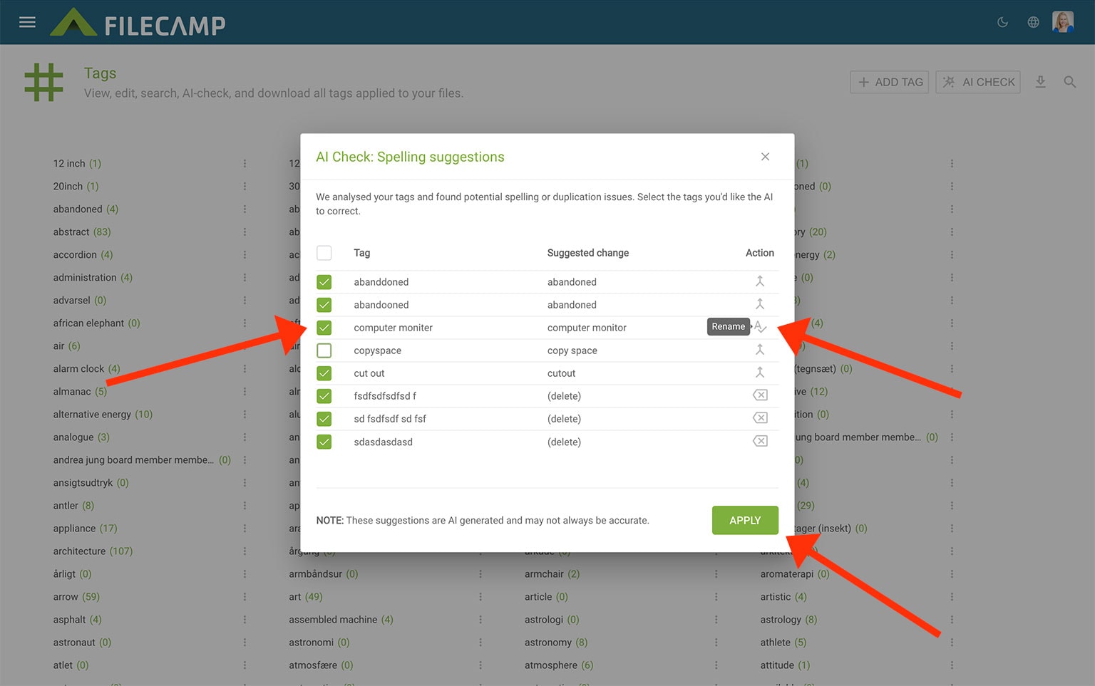 You can also let AI correct your tags. It will suggest tags to merge, rename, or delete. Select the tags you want to update and click APPLY.
